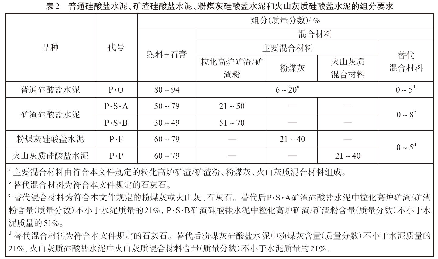 本次標(biāo)準(zhǔn)修訂為:主要混合材料的允許摻量為大于等于6% 且小于等于20%,其中可以使用小于等于5%的替代混合材料替代主要混合材料。這里的主要混合材料是指符合標(biāo)準(zhǔn)規(guī)定的粒化高爐礦渣/ 礦渣粉、粉煤灰、火山灰質(zhì)混合材料,可以是一種材料單獨(dú)使用也可以是兩種或三種材料復(fù)合使用。替代混合材料則指石灰石。具體見(jiàn)表2 中的備注a和b。